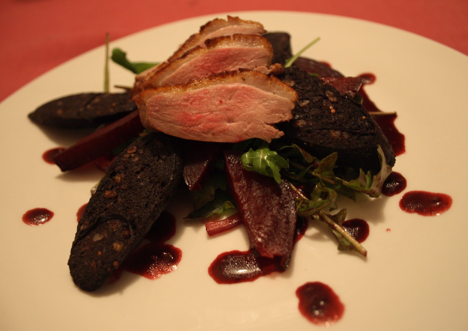 - To serve combine the salad leaves and the thinly sliced red onion, dress with some of the blueberry vinaigrette dot over the roasted beetroot and black pudding, top with the duck breast and then decorate with some more of the vinaigrette.